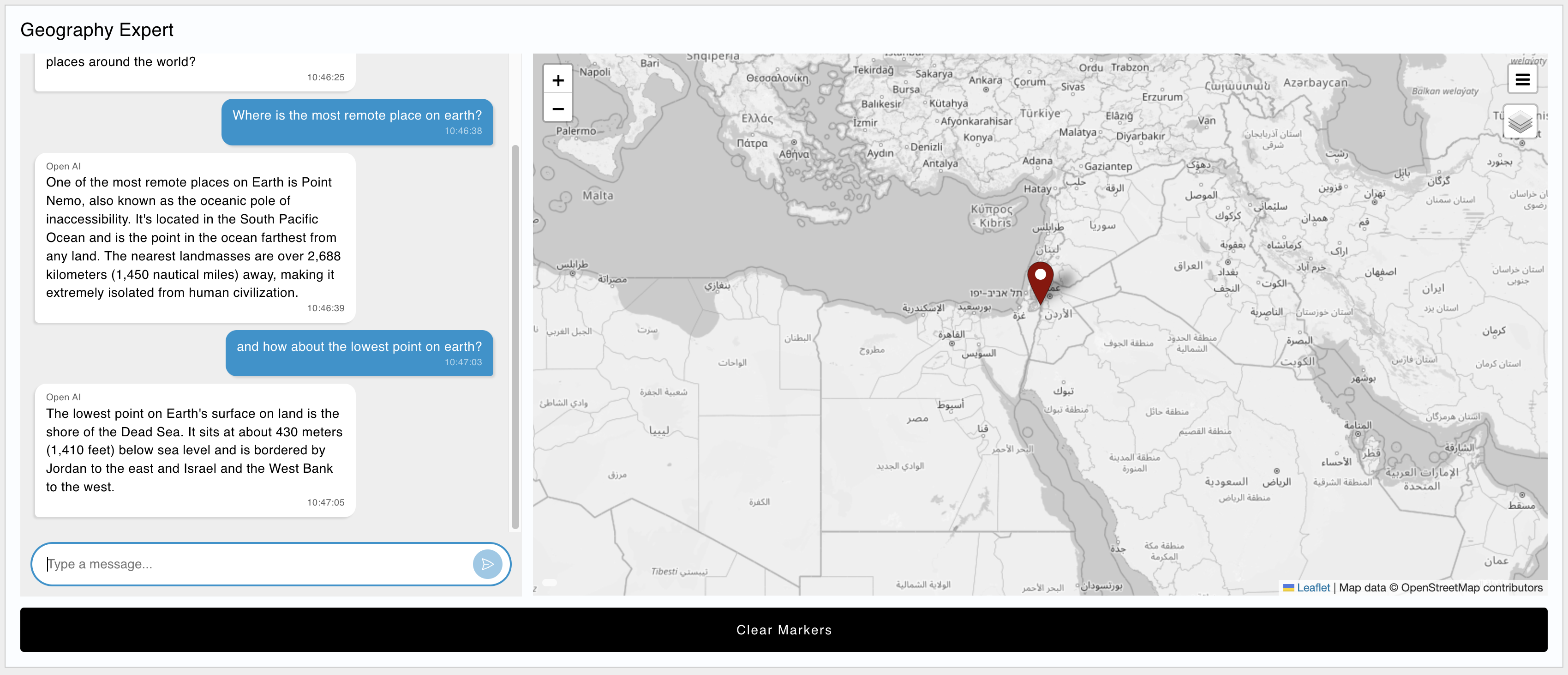 This agent was provisioned to provide coordinate data alongside it's text-based answers, which are then rendered onto a World Map, also rendered within FlowFuse Dashboard.