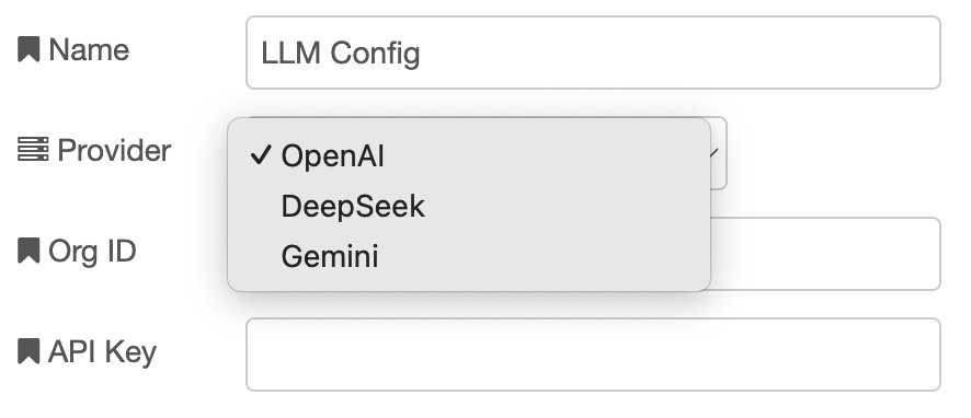 You can select your preferred LLM provider, enter your API key, and choose a specific LLM model as needed.