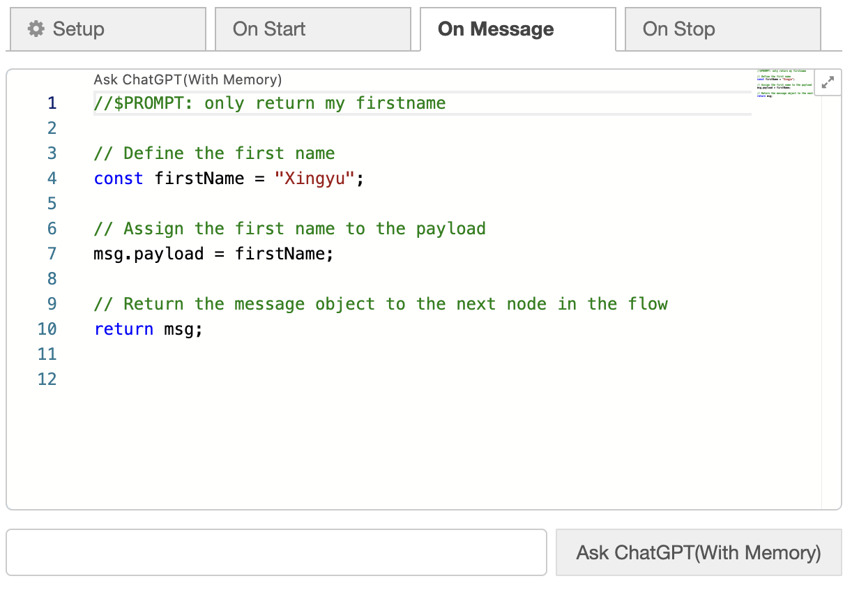 A Node-RED node that adds an "Ask ChatGPT(With Memory)" input and button to a duplicate of the built-in function node.