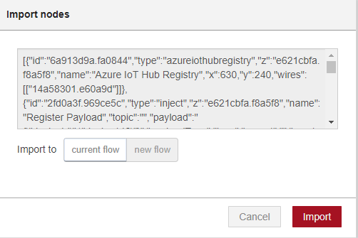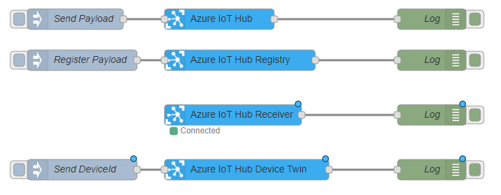 [{"id":"6a913d9a.fa0844","type":"azureiothubregistry","z":"e621cbfa.f8a5f8","name":"Azure IoT Hub Registry","x":630,"y":240,"wires":[["14a58301.e60a9d"]]},{"id":"2fd0a3f.969ce5c","type":"inject","z":"e621cbfa.f8a5f8","name":"Register Payload","topic":"","payload":"{\"deviceId\":\"device146\"}","payloadType":"json","repeat":"","crontab":"","once":false,"x":400,"y":240,"wires":[["6a913d9a.fa0844"]]},{"id":"14a58301.e60a9d","type":"debug","z":"e621cbfa.f8a5f8","name":"Log","active":true,"console":"false","complete":"true","x":910,"y":240,"wires":[]},{"id":"f775e252.a49f2","type":"debug","z":"e621cbfa.f8a5f8","name":"Log","active":true,"console":"false","complete":"true","x":910,"y":180,"wires":[]},{"id":"95789379.e44d2","type":"azureiothub","z":"e621cbfa.f8a5f8","name":"Azure IoT Hub","protocol":"http","x":600,"y":180,"wires":[["f775e252.a49f2"]]},{"id":"228b0f18.7799c","type":"inject","z":"e621cbfa.f8a5f8","name":"Send Payload","topic":"","payload":"{\"deviceId\":\"device146\",\"key\":\"FgySFuUzwtQMrlS29GRr7luoW07RNAmKcMy5oPDA8pA=\",\"protocol\":\"http\",\"data\":\"{tem: 25, wind: 20}\"}","payloadType":"json","repeat":"","crontab":"","once":false,"x":390,"y":180,"wires":[["95789379.e44d2"]]},{"id":"817f33a3.ddf5f","type":"azureiothubreceiver","z":"e621cbfa.f8a5f8","name":"Azure IoT Hub Receiver","x":620,"y":340,"wires":[["c2825fc8.d6323"]]},{"id":"723d625e.52eb7c","type":"azureiothubdevicetwin","z":"e621cbfa.f8a5f8","name":"Azure IoT Hub Device Twin","x":640,"y":440,"wires":[["5e9fec30.6a52f4"]]},{"id":"c2825fc8.d6323","type":"debug","z":"e621cbfa.f8a5f8","name":"Log","active":true,"console":"false","complete":"true","x":910,"y":340,"wires":[]},{"id":"5e9fec30.6a52f4","type":"debug","z":"e621cbfa.f8a5f8","name":"Log","active":true,"console":"false","complete":"true","x":910,"y":440,"wires":[]},{"id":"3afc72bf.5c112e","type":"inject","z":"e621cbfa.f8a5f8","name":"Send DeviceId","topic":"","payload":"device146","payloadType":"str","repeat":"","crontab":"","once":false,"x":400,"y":440,"wires":[["723d625e.52eb7c"]]}]Double-click the Register Payload node