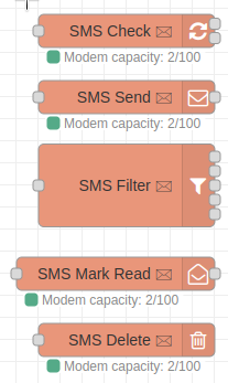 Node has 2 outputs. First is array of all messages stored on modem, second one is modem capacity. For convenience, modem capacity is also displayed as status on every zte-sms node that has modem configured.
